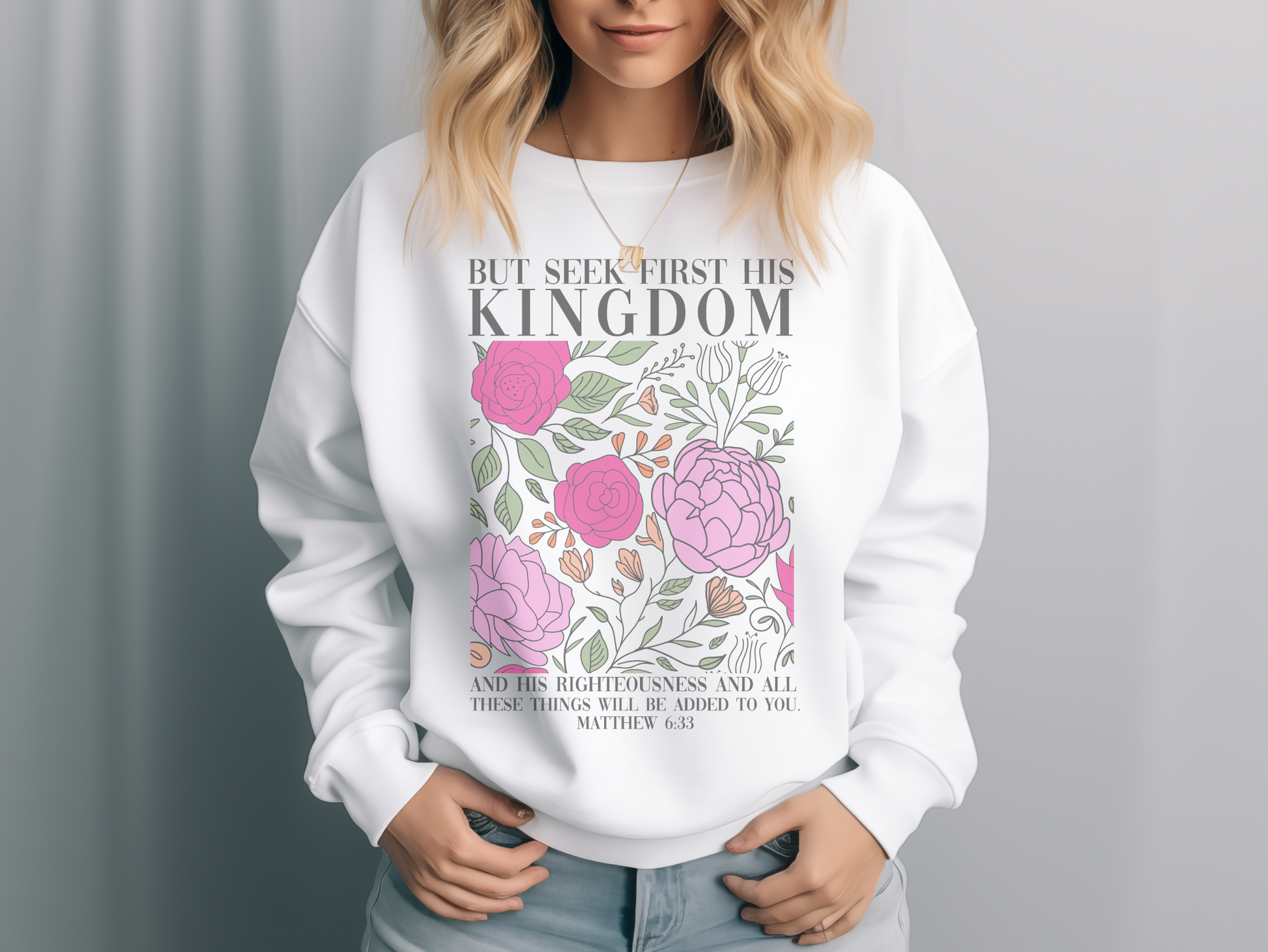 Vintage Printed Faith Sweatshirt | Bright Multi Matthew 6:33 Seek First His Kingdom